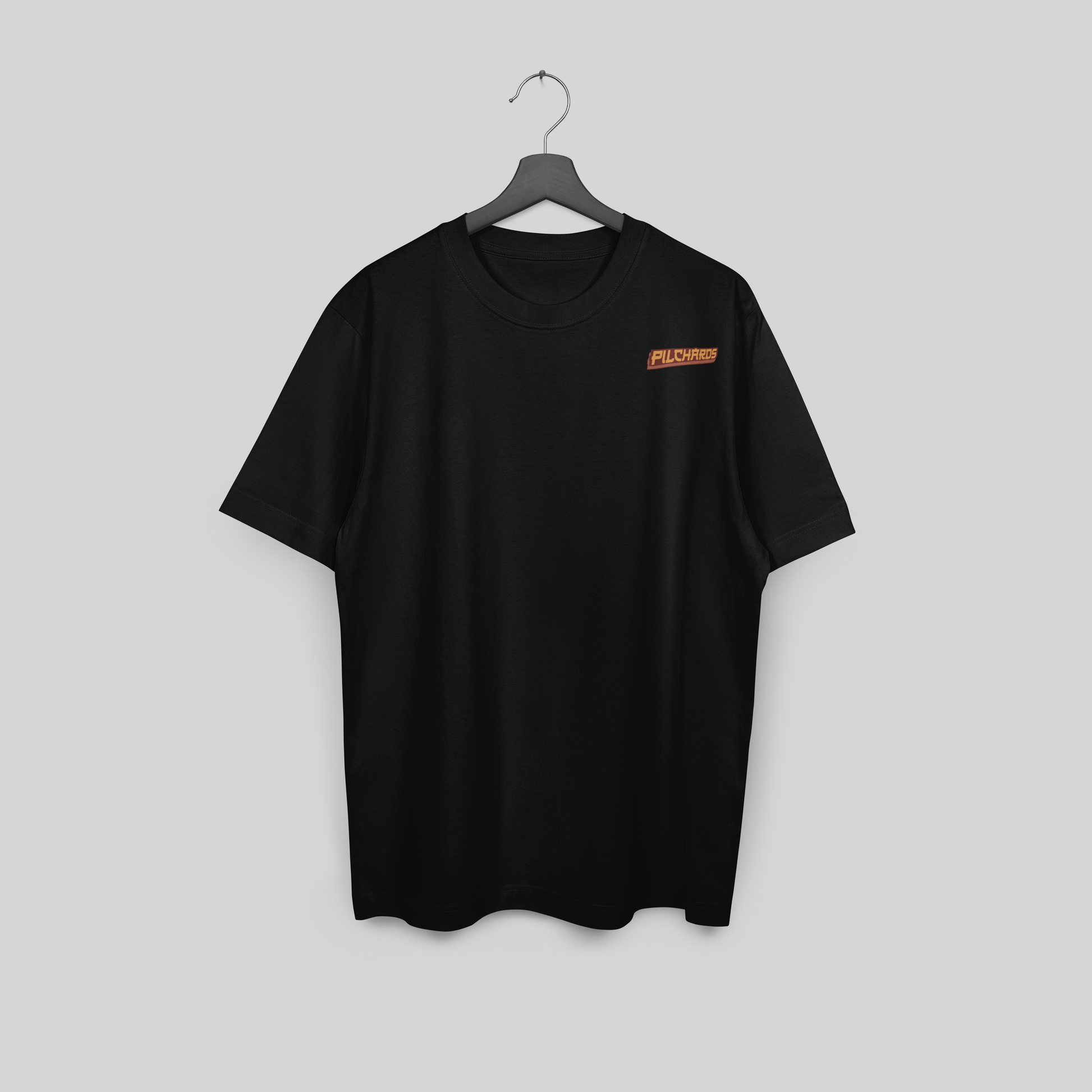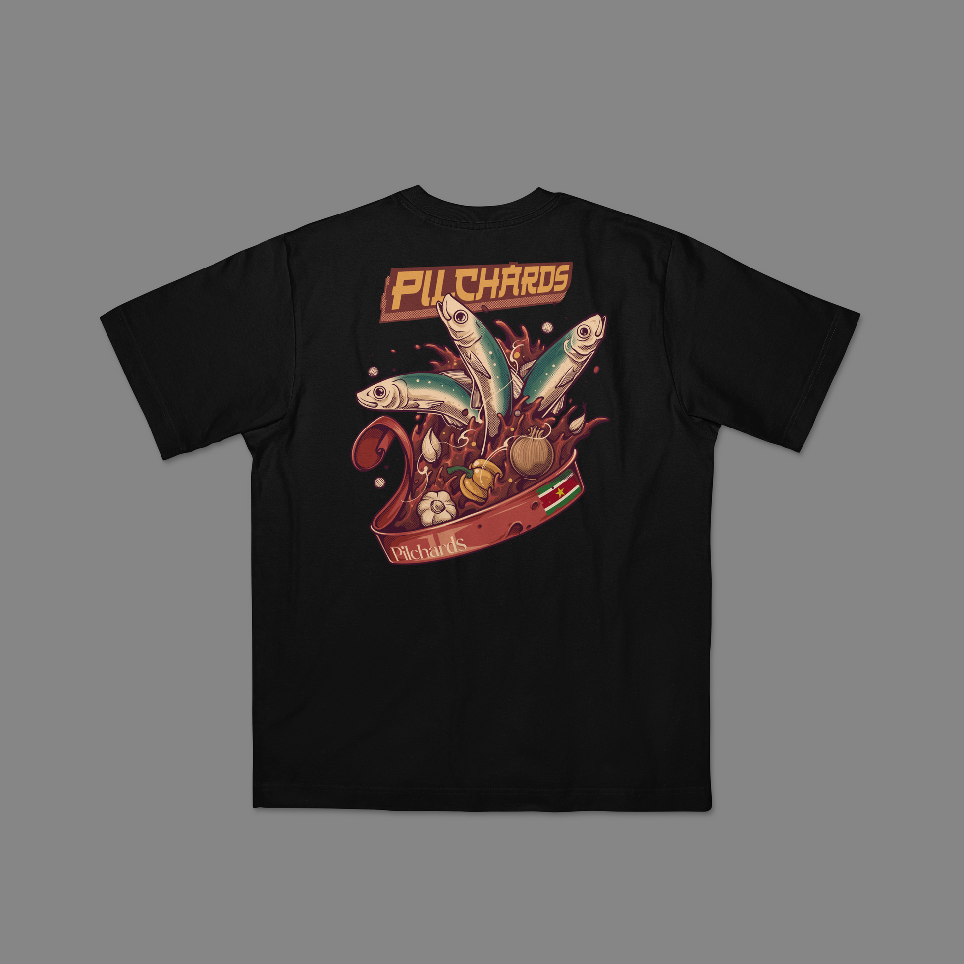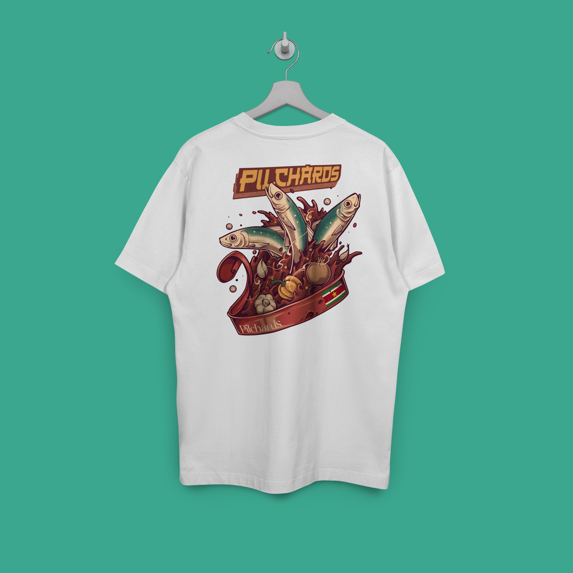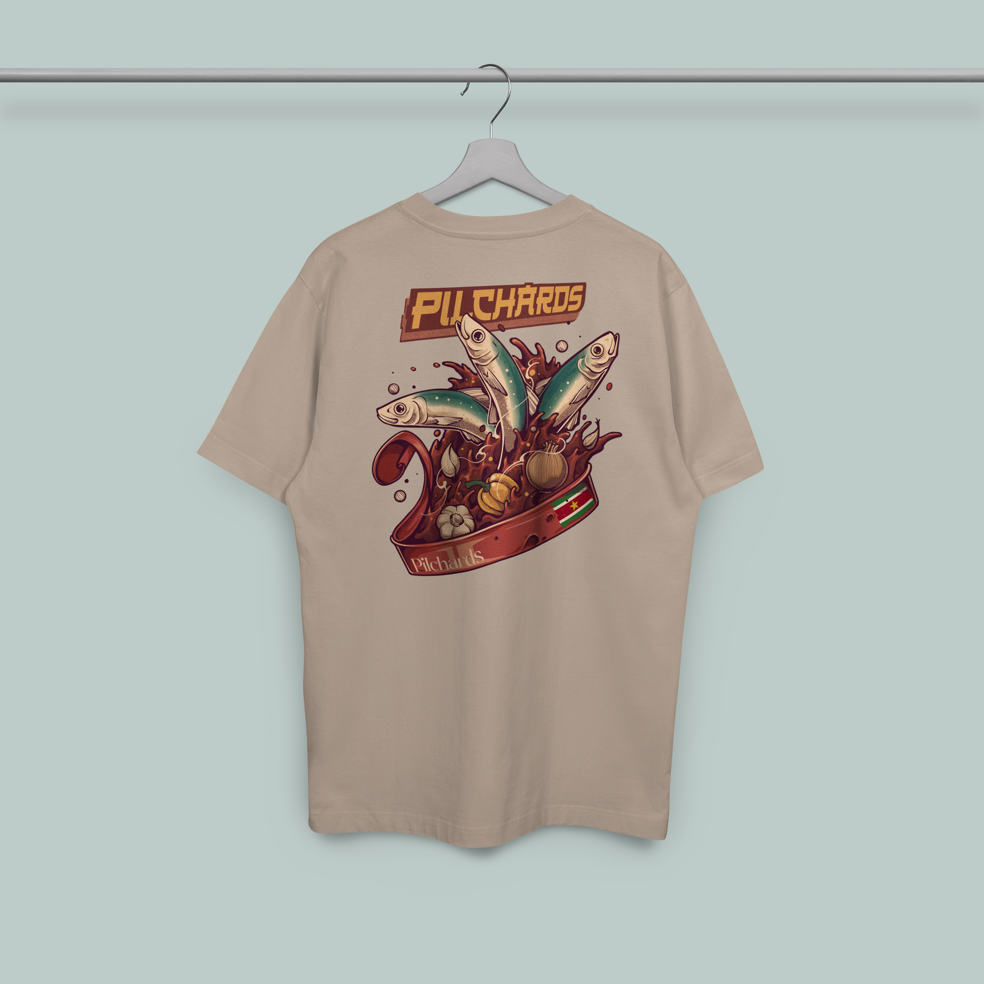Our "Pilchards 'Sardines in a Can'" Oversized T-shirt, made from 100% cotton with a comfortable 240 GSM weight, captures the essence of this cherished dish. The Pilchards logo on the front is just a hint of the larger, eye-catching design on the back, celebrating this unique culinary favorite.